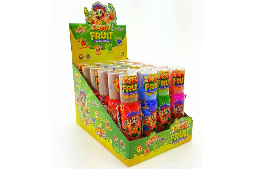 Funny Fruit Candy Spray: fruchtiger Sprüh-Spaß in vier Geschmacksrichtungen – süß, intensiv und perfekt für unterwegs. Erdbeere, Cola, Apfel und Heidelbeere.